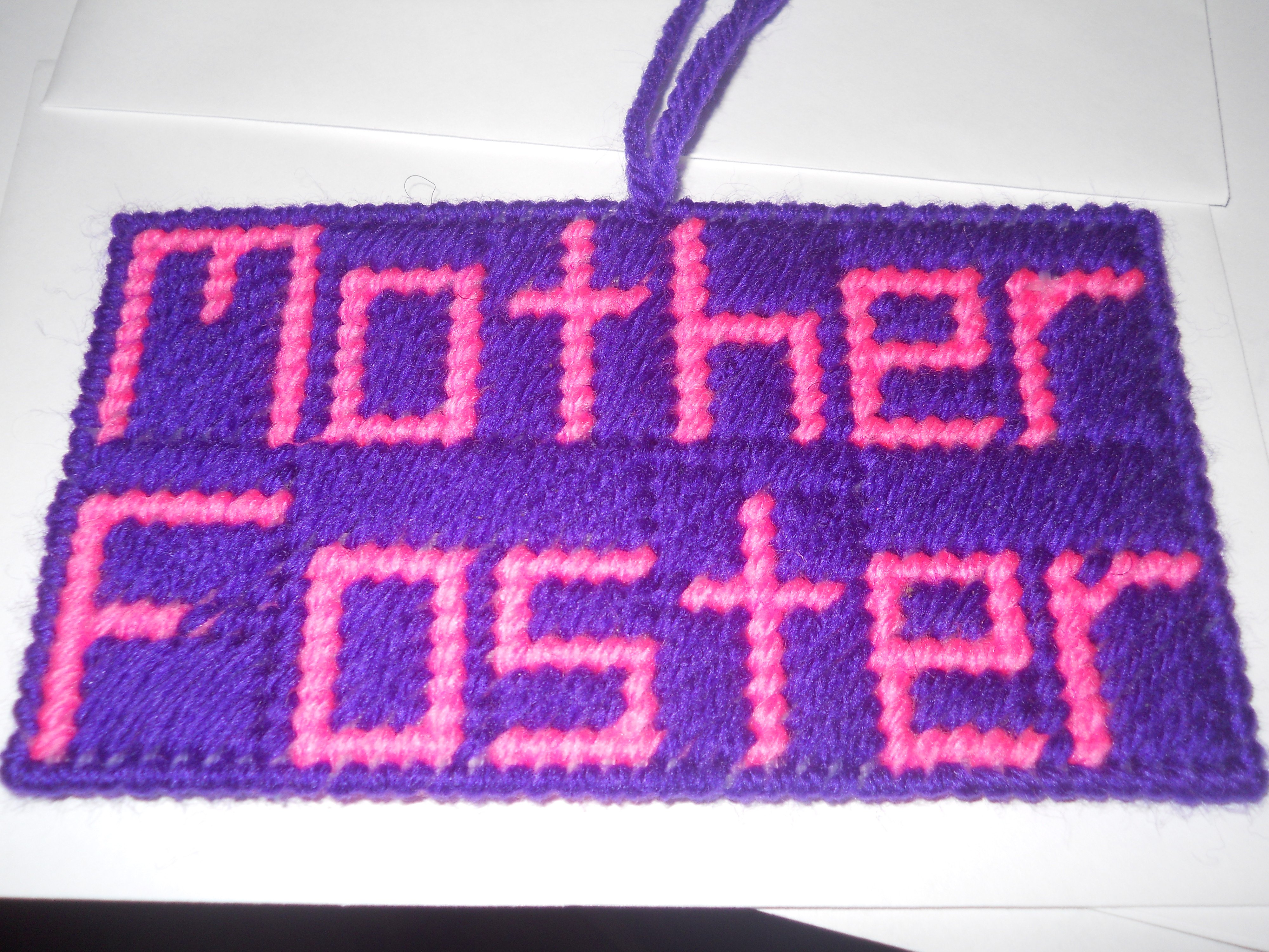 Needlepoint Title Wall Hanging are get gifts and any names can be made. Size is 4 inches wide and length will vary depending on the length of the wording. Get two for one price. Any two colors of yarn and also made with plastic canvas mesh.