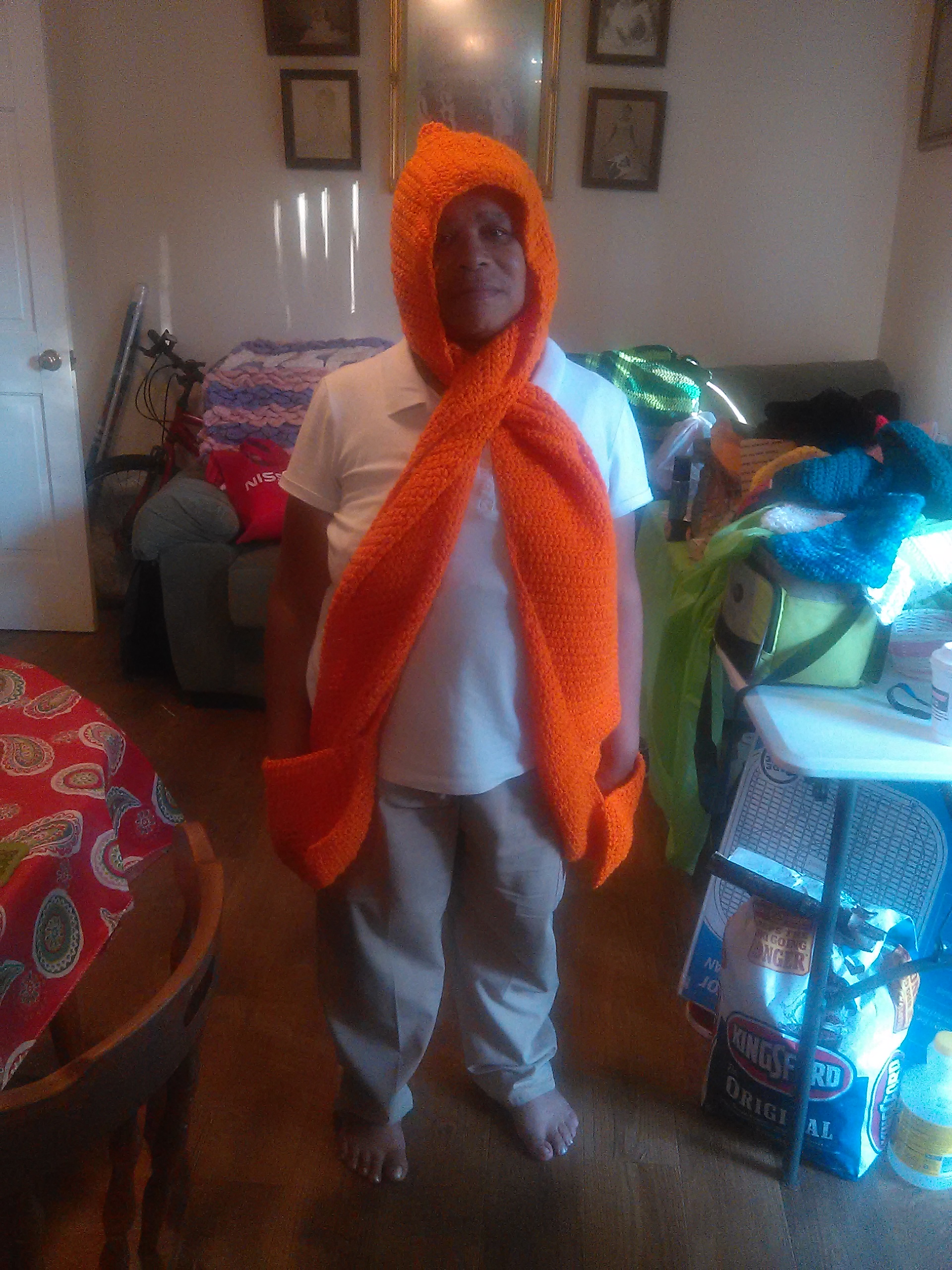 Crochet Hood Scarf will keep you nice and warm for the winter. the Scarf has pockets that will keep your hands nice and warm.