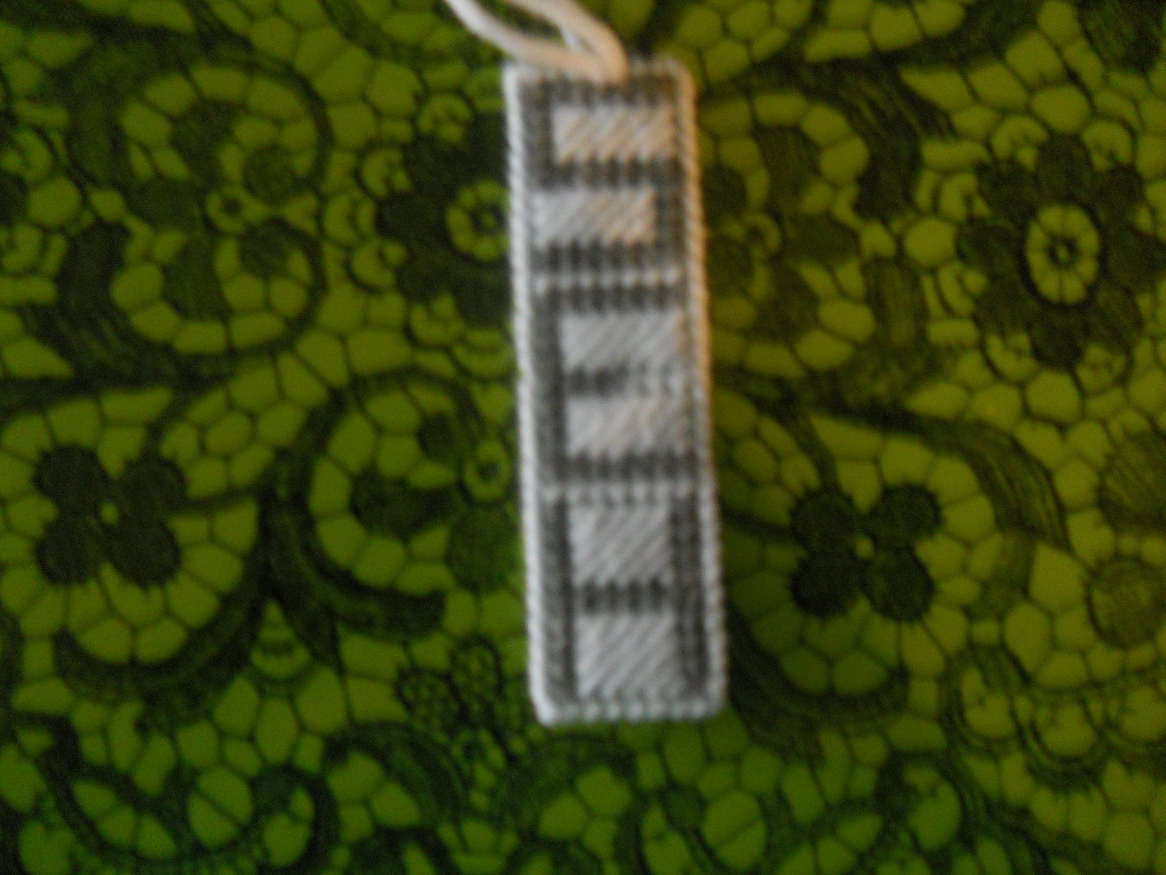 Needlepoint Bookmarks are made with yarn and plastic mesh canvas. Any name can be made and any two colors of yarn.