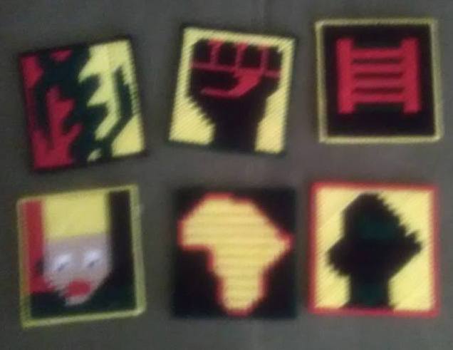 A Great set of African coaster that you can sit on your table or place on your wall. The Coaster set includes twelve African Symbols and a box for the coasters. Choose twelve African symbols that you like. The coasters are made with plastic canvas mesh and 4 colors of yarn ( red, green, black and yellow). The coasters are 4 x 4 1/2 inches and the box is 5 x 5 inches.